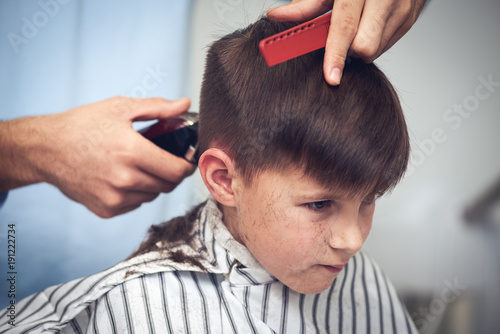 Boy Getting Haircut With Clippers At A Barbershop Stock
