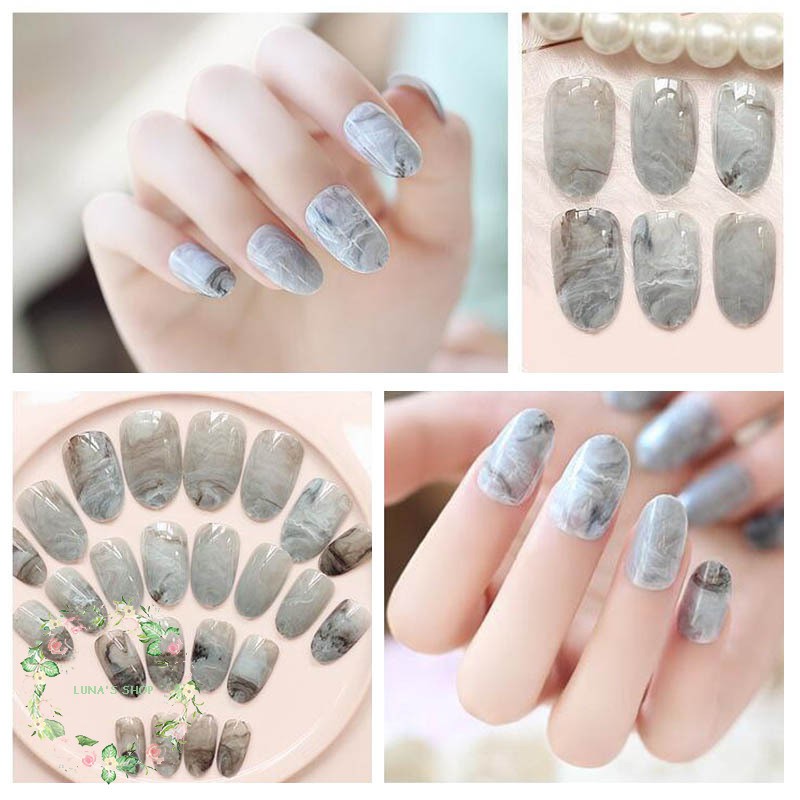 Girls Marble Design Grey Color Fake Nail French Short Full Cover